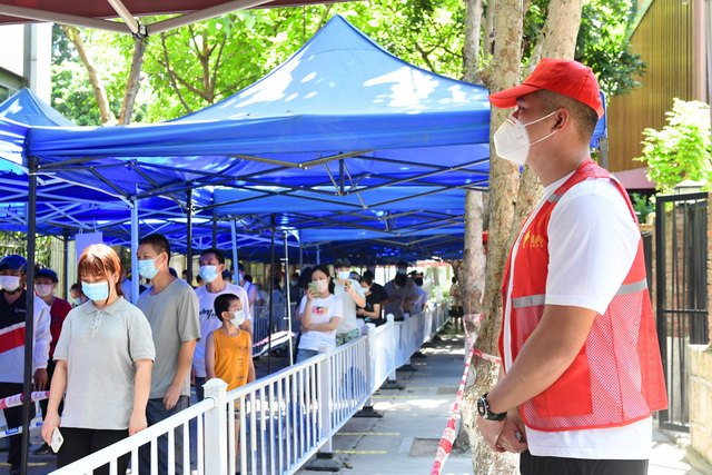 ▲象嶼志愿者在興華社區(qū)核酸檢測(cè)點(diǎn)