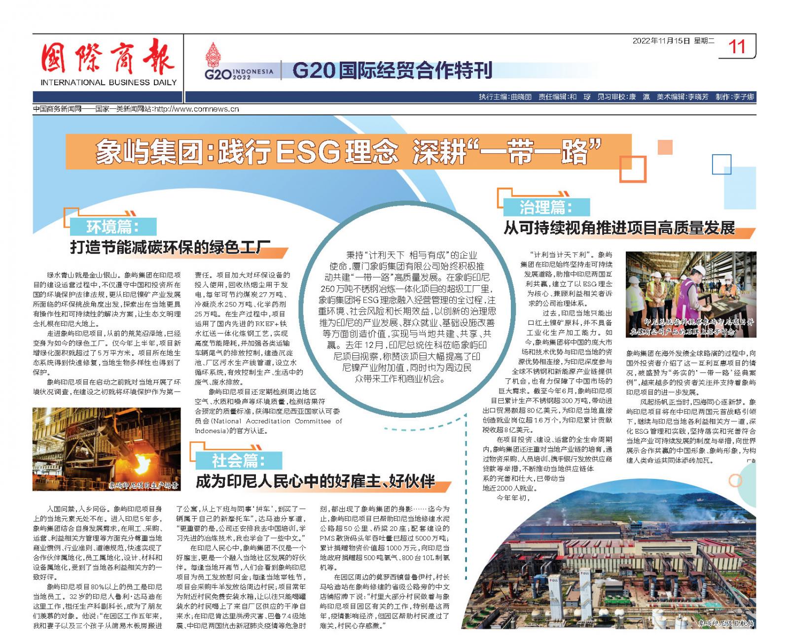 習(xí)近平主席近日出席二十國(guó)集團(tuán)領(lǐng)導(dǎo)人第十七次峰會(huì),這是黨的二十大勝利召開(kāi)后,中國(guó)最高領(lǐng)導(dǎo)人首次出席多邊峰會(huì)。值此之際,商務(wù)部《國(guó)際商報(bào)》推出《G20國(guó)際經(jīng)貿(mào)合作特刊》,專版報(bào)道象嶼集團(tuán)作為中國(guó)國(guó)有企業(yè)出海、深耕“一帶一路”的典型代表,積極踐行ESG理念,為促進(jìn)產(chǎn)業(yè)鏈供應(yīng)鏈穩(wěn)定、人民福祉增加和社會(huì)文明進(jìn)步注入象嶼力量的生動(dòng)實(shí)踐,現(xiàn)全文轉(zhuǎn)載如下。