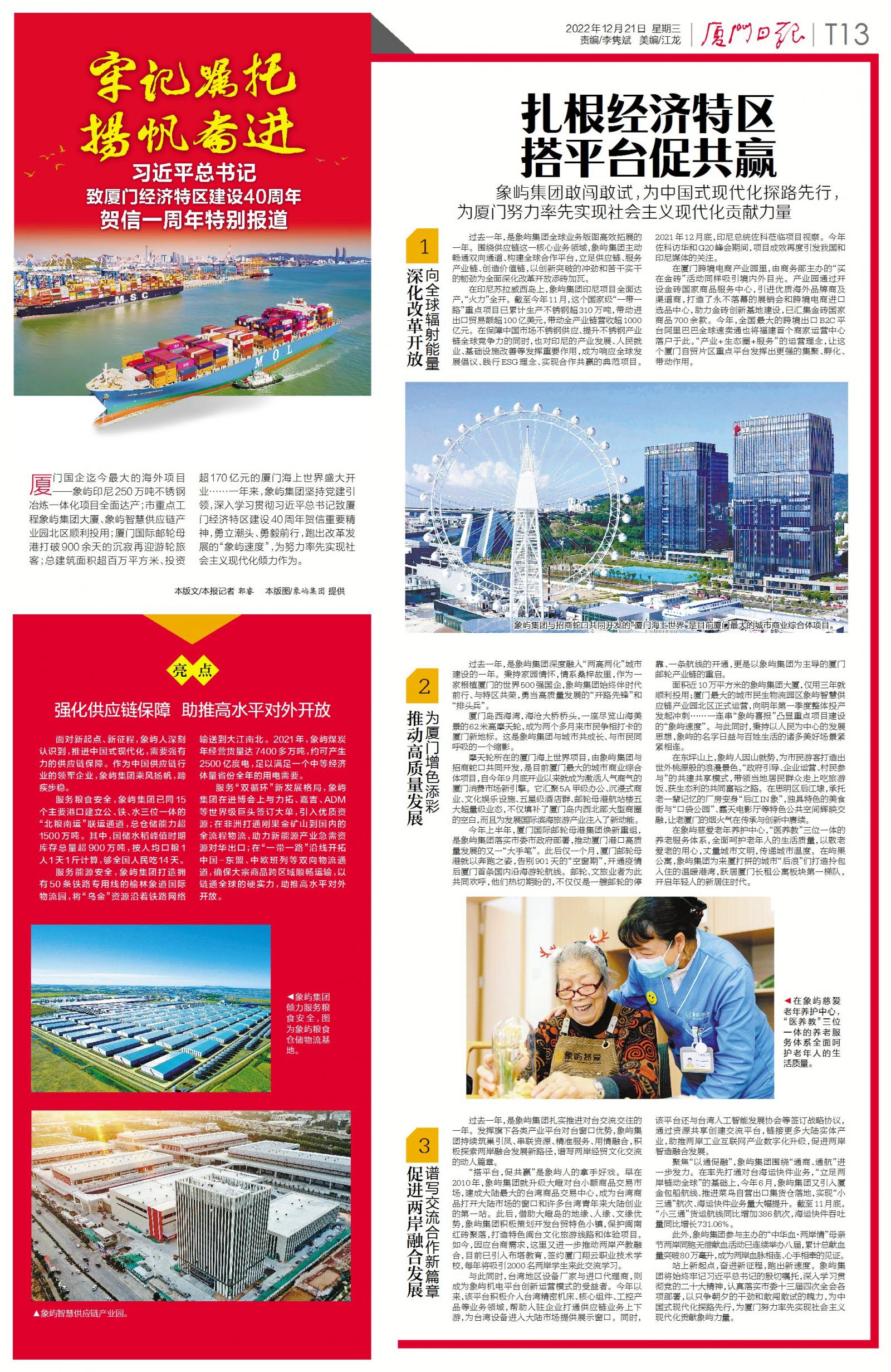 廈門國企迄今最大的海外項(xiàng)目——象嶼印尼250萬噸不銹鋼冶煉一體化項(xiàng)目全面達(dá)產(chǎn);市重點(diǎn)工程象嶼集團(tuán)大廈、象嶼智慧供應(yīng)鏈產(chǎn)業(yè)園北區(qū)順利投用;廈門國際郵輪母港打破900余天的沉寂再迎游輪旅客;總建筑面積超百萬方、投資超170億元的廈門海上世界盛大開業(yè)……一年來,象嶼集團(tuán)堅(jiān)持黨建引領(lǐng),深入學(xué)習(xí)貫徹習(xí)近平總書記致廈門經(jīng)濟(jì)特區(qū)建設(shè)40周年賀信重要精神,勇立潮頭、勇毅前行,跑出改革發(fā)展的“象嶼速度”,為努力率先實(shí)現(xiàn)社會(huì)主義現(xiàn)代化傾力作為。今天,廈門日報(bào)推出特刊《牢記囑托 揚(yáng)帆奮進(jìn) 習(xí)近平總書記致廈門經(jīng)濟(jì)特區(qū)建設(shè)40周年賀信一周年特別報(bào)道》,現(xiàn)全文轉(zhuǎn)載如下。