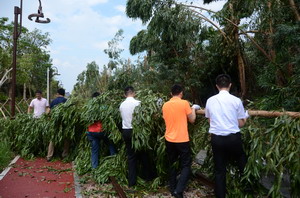 象嶼集團(tuán)陳方副總裁、邵蕰默副書記、林俊杰副總裁等領(lǐng)導(dǎo),上午奔波在島內(nèi)外察看災(zāi)情,為了參與志愿服務(wù),中午匆忙扒了兩口飯就趕回來,率先垂范,身穿志愿者紅馬甲,頭頂烈日,撿樹枝、清障礙,汗水濕透了衣衫。
