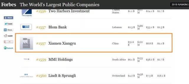 今日,美國(guó)《福布斯》雜志發(fā)布2018年“全球上市公司2000強(qiáng)”排行榜(Forbes Global 2000),廈門象嶼(600057)排名1557名,較去年躍升228位。