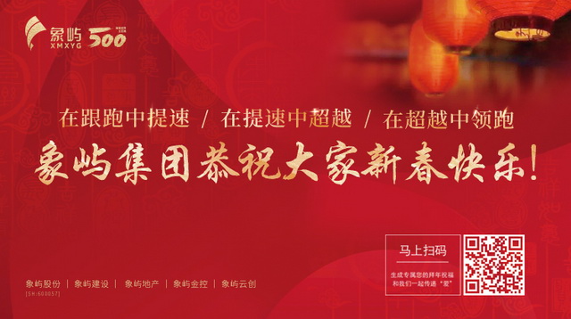 流轉的光陰,見證著奮斗者不曾停息的腳步;騰飛的中國,激蕩著創(chuàng)新者永立時代的潮頭。在新春佳節(jié)來臨之際,我們謹代表集團各套班子向奮斗在海內外各個工作崗位上的象嶼人、所有關心和支持象嶼事業(yè)發(fā)展的各級領導和社會各界朋友拜年,并通過你們向你們的家人致以節(jié)日的美好祝福!祝大家新春愉快!