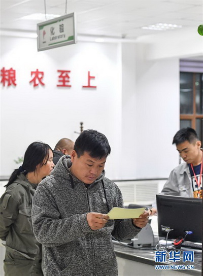 在黑龍江北安市的北安象嶼金谷農(nóng)產(chǎn)有限責(zé)任公司,一位糧農(nóng)在查看糧食化驗結(jié)果