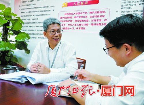 象嶼股份黨委副書(shū)記、副總經(jīng)理齊衛(wèi)東(左)跟員工探討項(xiàng)目落實(shí)情況。(《廈門日?qǐng)?bào)》記者黃曉珍攝)