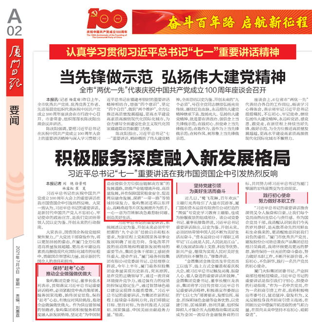 7月5日,《廈門日?qǐng)?bào)》以《積極服務(wù)深度融入新發(fā)展格局》為題,報(bào)道我市國(guó)資國(guó)企系統(tǒng)學(xué)習(xí)貫徹情況,突出報(bào)道了象嶼集團(tuán)黨委書記、董事長(zhǎng)張水利的學(xué)習(xí)心得。
