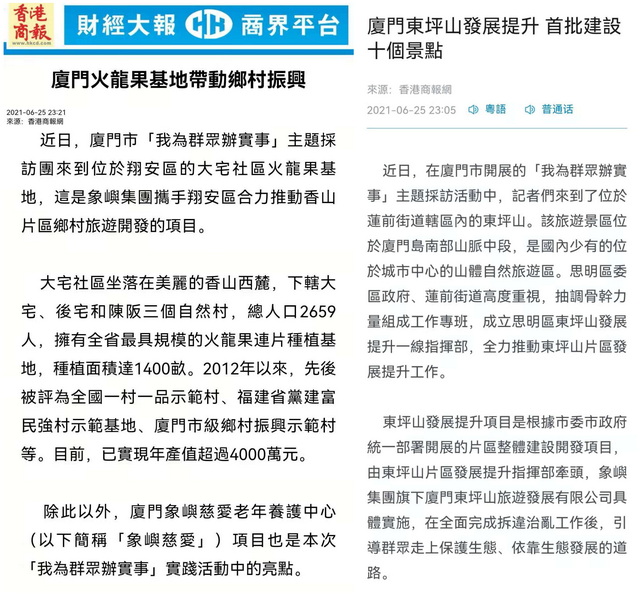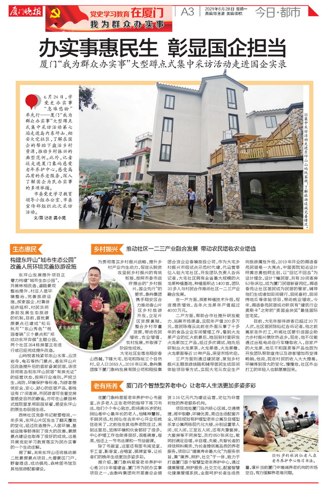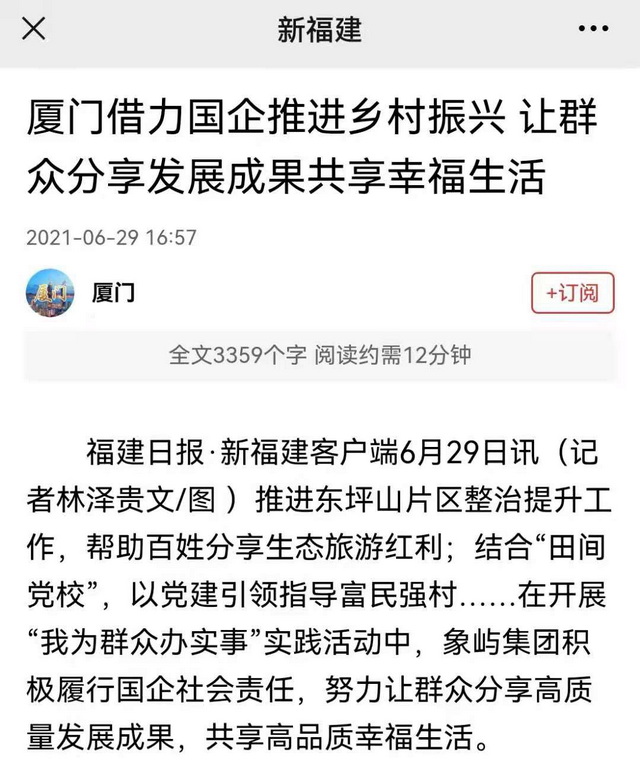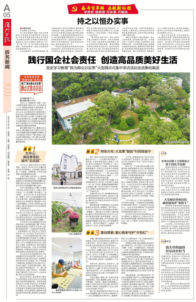 象嶼集團正以“我為群眾辦實事”實踐活動為抓手,深入學習貫徹習近平總書記重要講話精神,著力解決人民群眾急難愁盼問題,為百姓創(chuàng)造美好生活。近日,由廈門市委黨史學習教育領導小組辦公室、廈門市委宣傳部組織的黨史學習教育“我為群眾辦實事”大型蹲點式集中采訪走進象嶼集團。境內外近20家媒體深入東坪山發(fā)展提升項目、大宅鄉(xiāng)村振興項目和象嶼慈愛老年養(yǎng)護中心,對象嶼集團辦實事、解民憂、惠民生的創(chuàng)新舉措進行集中報道。