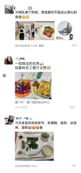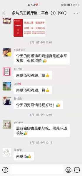 它更美在有家的感覺(jué)。每逢節(jié)日,餐廳用精心準(zhǔn)備的美食,送上滿滿的祝福。婦女節(jié)女神披薩、母親節(jié)養(yǎng)生湯、端午肉粽、中秋月餅……舌尖上的幸福,飽含著家的溫暖。餐廳還先后建立4個(gè)交流微信群,參與員工近2000人。象嶼家人們的每一項(xiàng)意見(jiàn)、建議,餐廳都會(huì)迅速答復(fù),并每周公示員工反饋問(wèn)題的解決進(jìn)展。在交流群里、在朋友圈里,員工的點(diǎn)贊之聲不絕于耳,餐廳平均滿意度保持在90%以上。