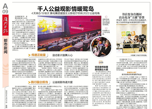 把關(guān)愛送到需要的人身邊。象嶼集團(tuán)的公益之心也在影響著廈門青少年。在廈門外國語學(xué)校湖里分校專場,近60位師生共同觀看了《奇跡·笨小孩》。“對(duì)學(xué)生來說,收獲的不僅是影片主人公永不言棄的精神,還有國企開展公益活動(dòng)體現(xiàn)的社會(huì)責(zé)任感。象嶼集團(tuán)的擔(dān)當(dāng)精神對(duì)孩子們的成長具有教育意義。”廈門外國語學(xué)校湖里分校德育主任薛麗清告訴記者,學(xué)校和象嶼集團(tuán)是“近鄰黨建”共建單位,多年來象嶼集團(tuán)不僅捐資助力校園文化設(shè)施改造,還為學(xué)生提供公益觀影、愛心植樹、象棋嘉年華等成長平臺(tái),助力孩子們健康成長。