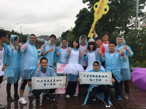 下雨天,依舊湮滅不了象嶼人的熱情。挑戰(zhàn)團(tuán)隊(duì)們紛紛冒雨接受挑戰(zhàn),4位隊(duì)員齊心協(xié)力地推動(dòng)載著17位小伙伴的中巴車(chē)。