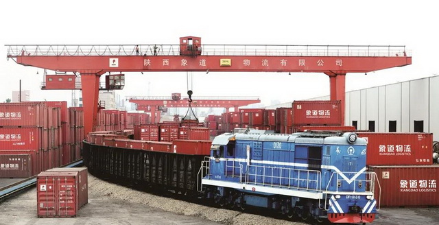 河南省三門峽市,三門峽象道物流園區(qū)車站里,滿載氧化鋁的100個集裝箱即將發(fā)往新疆昌吉,用于制造鋁錠。這一列鐵路集裝箱裝載的氧化鋁重達3000噸,相當(dāng)于95輛大型貨車的運輸量,而能耗和污染物排放僅是公路運輸?shù)?5%和8%。
