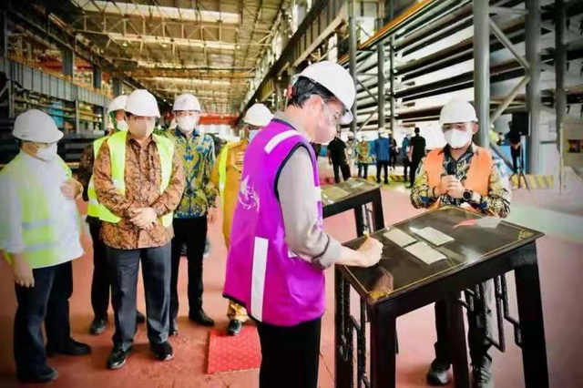 佐科參觀園區(qū)內(nèi)的象嶼印尼250萬(wàn)噸不銹鋼一體化冶煉項(xiàng)目(以下簡(jiǎn)稱(chēng)象嶼印尼項(xiàng)目),并在鑲有公司產(chǎn)品(不銹鋼坯)的石牌上簽字留念。