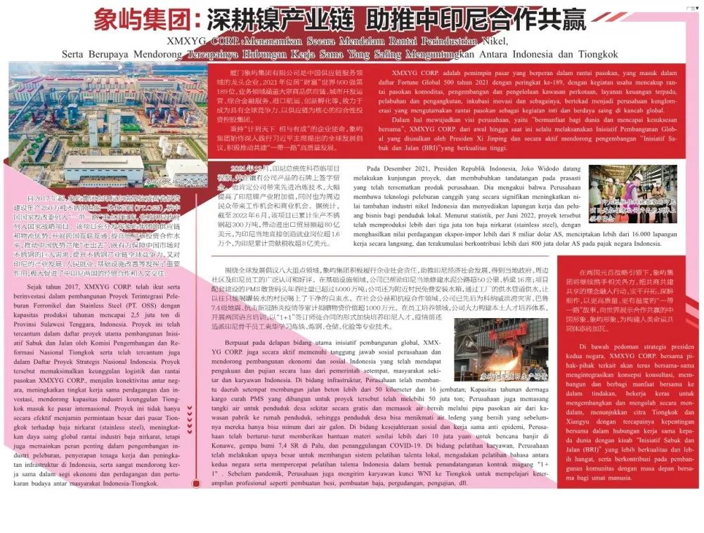 昨天,商務(wù)部《國際商報(bào)》以《象嶼集團(tuán):深耕鎳產(chǎn)業(yè)鏈 助推中印尼合作共贏》為題刊發(fā)專題報(bào)道,介紹象嶼集團(tuán)在印尼投資建設(shè)年產(chǎn)250萬噸不銹鋼冶煉一體化項(xiàng)目,推動高質(zhì)量共建“一帶一路”,促進(jìn)中印尼兩國經(jīng)貿(mào)合作和人文交往的突出成效。